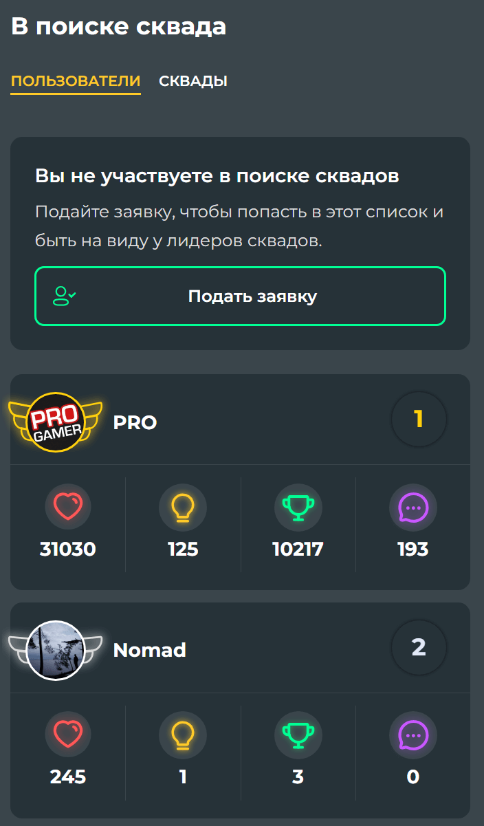Теперь лидеры сквадов будут видеть вас в списке кандидатов, а на странице вашего профиля появится статус «В поиске сквада» с кнопкой приглашения.