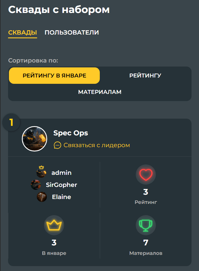 На странице «В поиске сквада» перейдите во вкладку «Сквады» и посмотрите список сквадов, объявивших набор. Вы можете связаться с лидером через мессенджер и предложить свою кандидатуру напрямую.