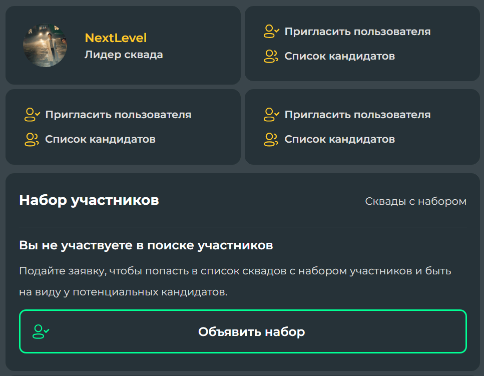 На странице вашего сквада доступны несколько инструментов для набора участников: